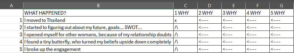 Preview image – I didn’t post my own thoughts here. Looking at the 5Why method „in reverse”, you can notice that consecutive events should perfectly fit with the insights and needs from the previous step. In theory, this makes them an ideal ‘test’ of whether we’re moving in the right direction. Sad story that works only backwards.
